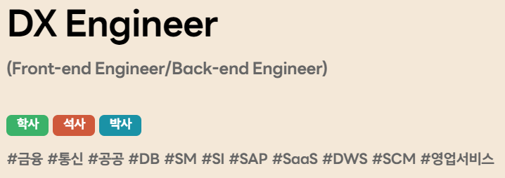 근무지는 서울과 경기권만 뽑네요. 오피셜은 아니고 카더라 통신이지만, 위 이미지에 나열되어 있는 순서가 무의미한 순서는 아니라고 봅니다. 금융, 통신, 공공 순으로 채용 규모가 클 것 같네요. 보통 SI/SM이라고 하는데, SI보다 SM이 먼저 적혀 있네요? 그렇다는 건... SM 인력들을 위주로 뽑을 것 같기도 합니다. 뇌피셜이에요!!!