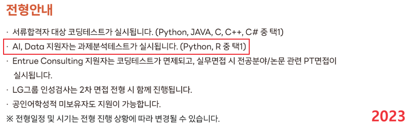 원래 데이터 직군 학사는 코딩테스트 대상이었는데, 2023년은 학사 데이터 직군 지원자도 과제분석 테스트 대상이네요.