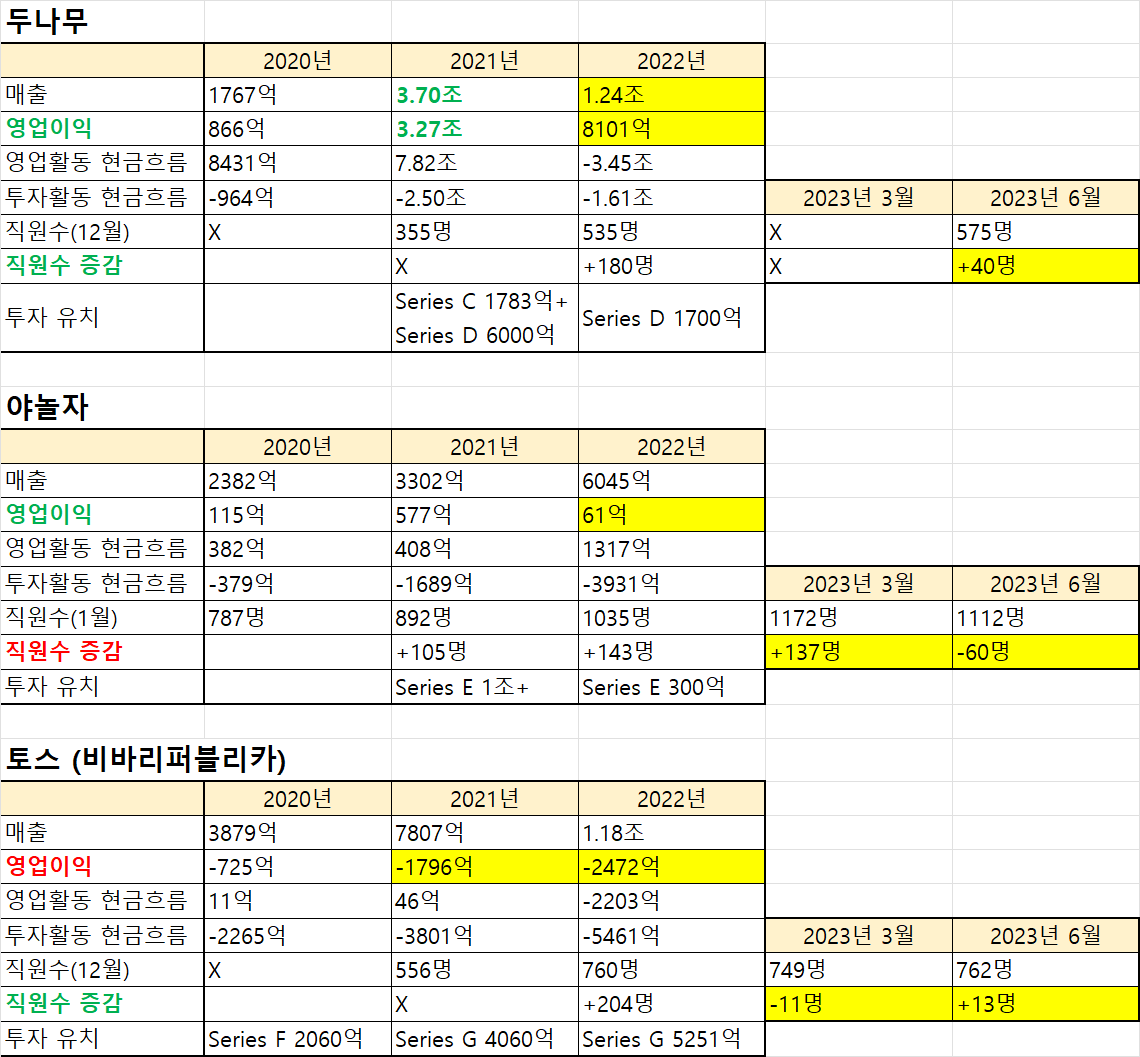 - 야놀자는 매출도 늘고 투자도 어마어마하게 받았어요. 적자는 아니지만 매출이 2~3배임에도 영업이익이 줄고 있네요. 그래서 고정비용이 많이 들어가는 직원수를 줄이는 걸까요...?