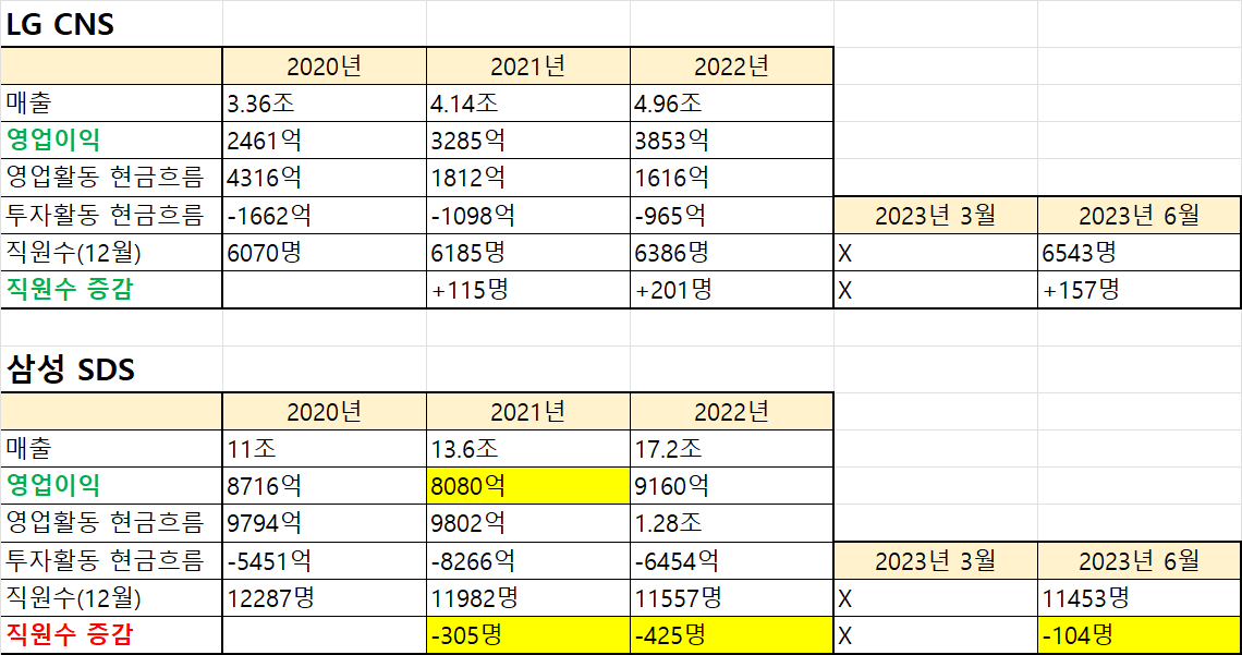 LG CNS와 삼성 SDS입니다! 대기업 명성에 맞게 영업이익은 흑자이고 매출 또한 준수하네요.