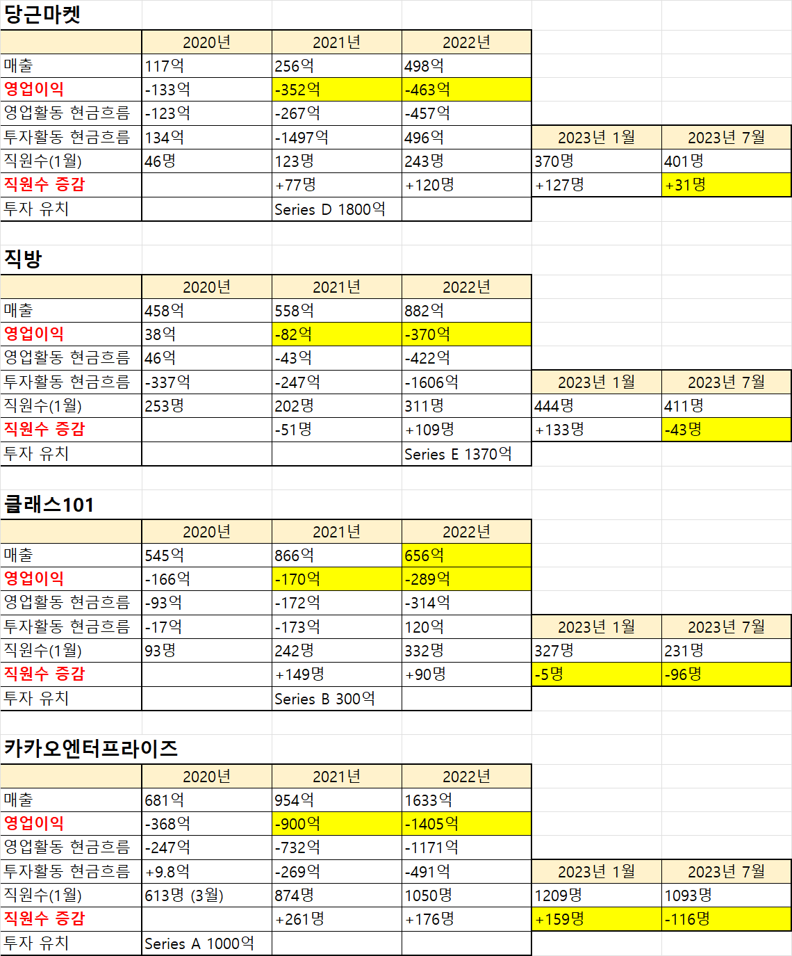 - 구조조정 빡시게 하고 있는 직방, 클래스101, 카카오엔터프라이즈의 현황입니다. 영업이익 흑자가 나지 않고 매출이 커짐에 따라 점점 적자도 커지는 상황이며 투자금으로 버티고 있지만 한계에 다다랐는 지 채용규모를 줄이다 못해 구조조정을 하는 상황이네요.