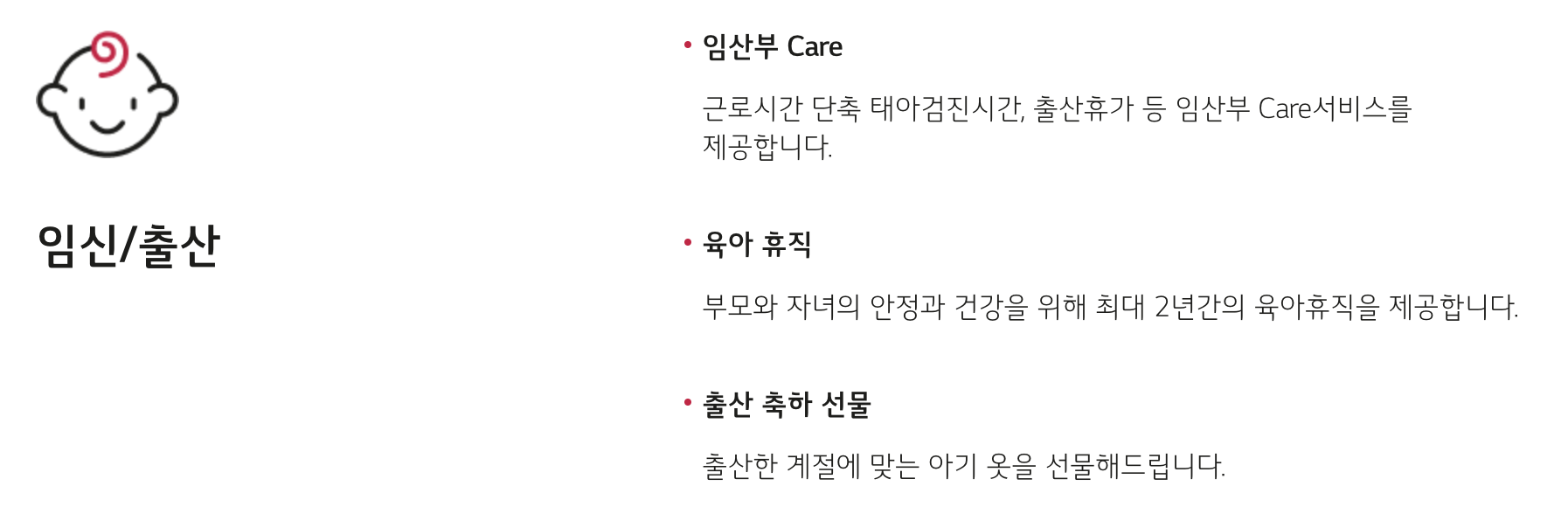 | 건강검진 | 만 35세 미만 : 본인 2년마다 + 배우자 X 만 35세 이상 : 본인 1년마다 + 배우자/부모님 1인 2년마다 |